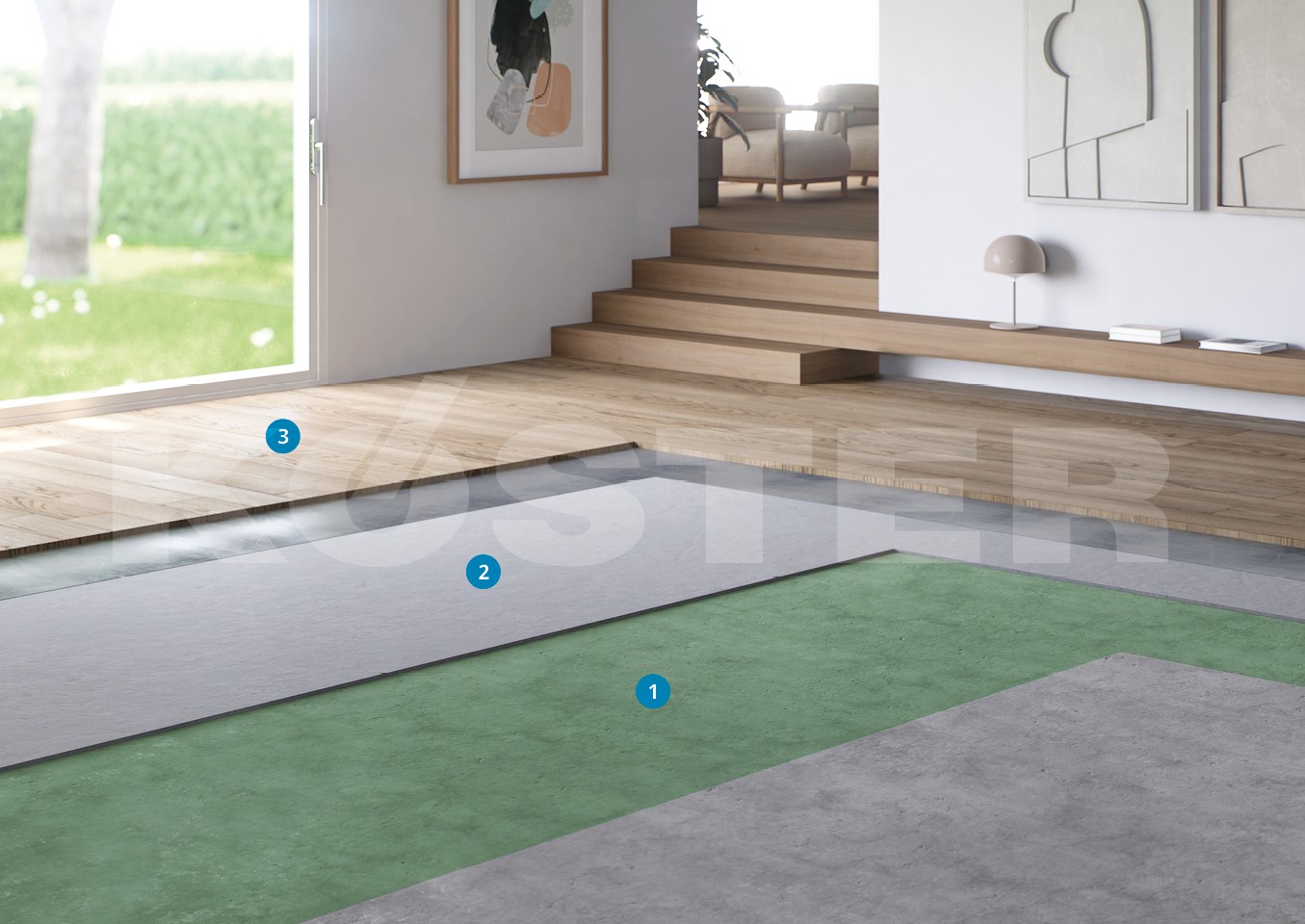 Following the self-leveling application, a vapor barrier or footfall sound insulation is installed to ensure a flawless and durable surface before the final installation of wooden or laminate flooring, resulting in a flawless and durable finish.
