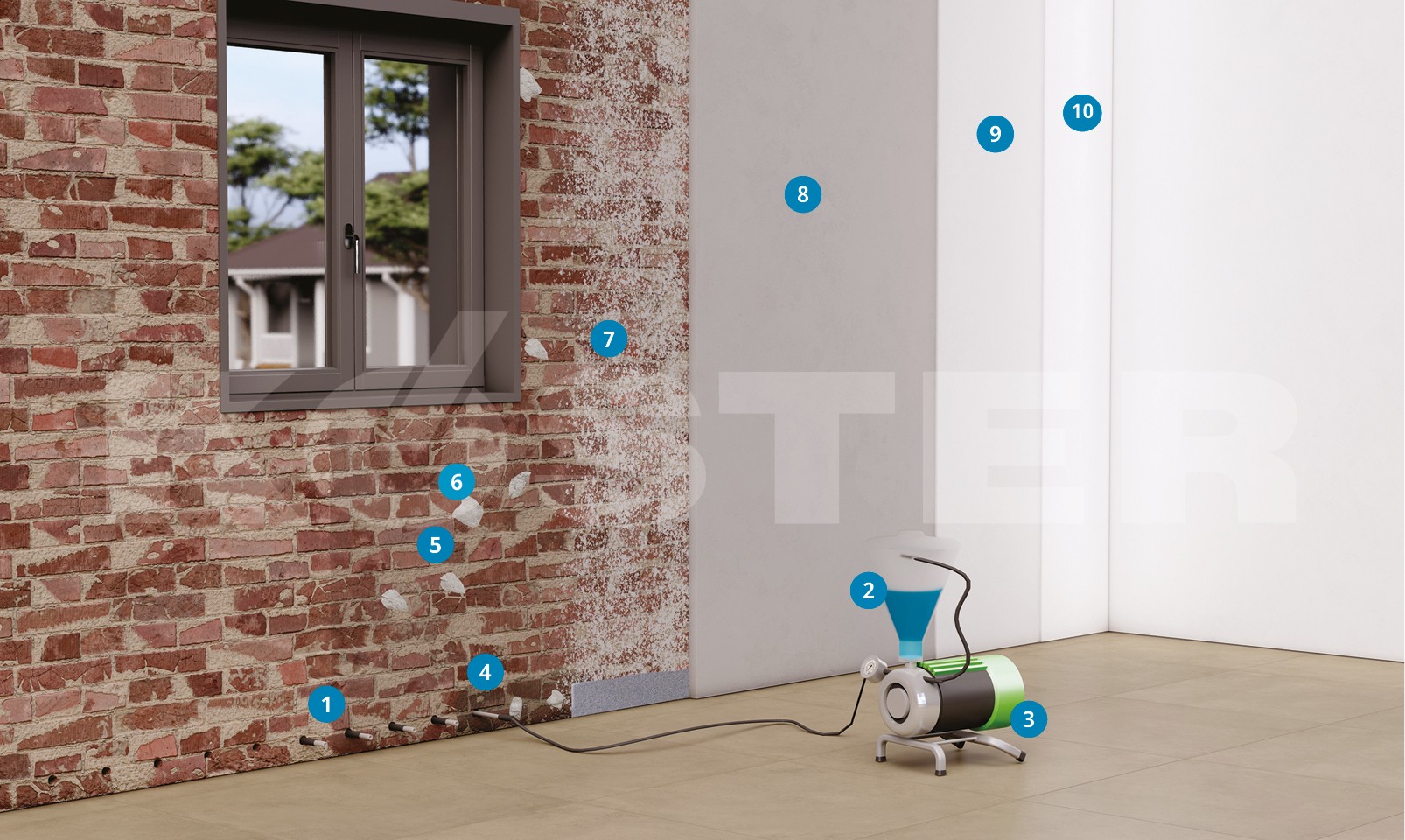In cases where damage is caused by rising moisture, the old plaster has to be removed from the wall. After the installation of the horizontal barrier, the application of KÖSTER Restoration Plaster is required. The KÖSTER Restoration Plaster allows the masonry to dry without damage. KÖSTER Restoration plasters are open to vapor diffusion and are hydrophobic. Salts remaining in the wall are absorbed by the KÖSTER Restoration Plasters so that salt doesn’t effloresce to the surface and doesn’t cause damage to the plaster or paint.