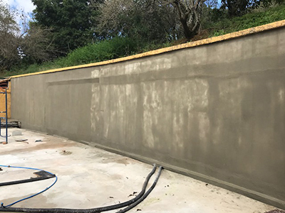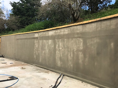 Waterproofing retaining walls of a basement in a residential house in Brazil with KÖSTER NB 1 Grey. Before the area waterproofing the surface had been primed with KÖSTER Polysil TG 500.